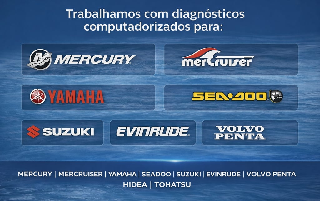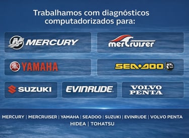 Especialistas em manutenção náutica para marcas como Yamaha, Suzuki e Mercury, Mercruiser ,Seadoo ,Volvo Penta , Tohatsu e Hídea e Evinrude.